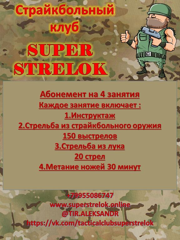Абонемент на 4 занятия 8000 руб. В корзину Абонемент на 4 занятия Каждое занятие включает : 1.Инструктаж 2.Стрельба из страйкбольного оружия 150 выстрелов 3.Стрельба из лука 20 стрел 4.Метание ножей 30 минут Абонемент на 4 занятия Каждое занятие включает : 1.Инструктаж 2.Стрельба из страйкбольного оружия 150 выстрелов 3.Стрельба из лука 20 стрел 4.Метание ножей 30 минут